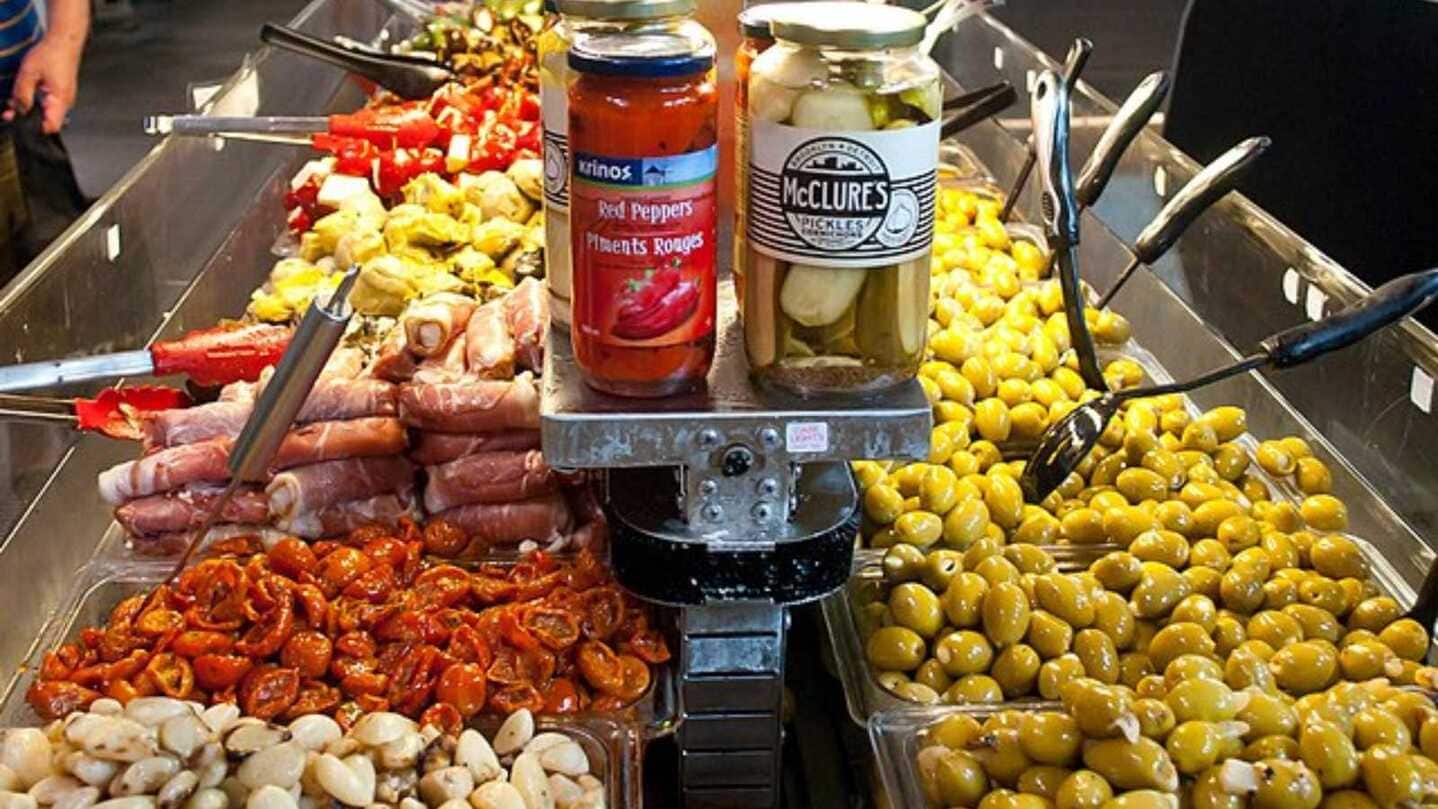 Peameal bacon sandwiches are the main attraction at this market, which presents classic Canadian cuisine, including peach pies and delicacies tinted with maple flavors.