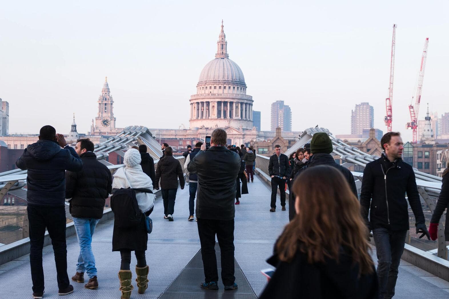 People walking across Millennium Bridge towards St Paul's Cathedral in London with a cityscape background.